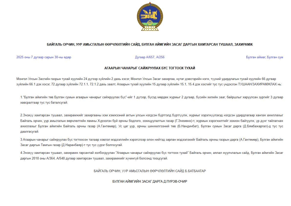 Булган аймаг Булган сум 1-р баг Байгаль орчны газар