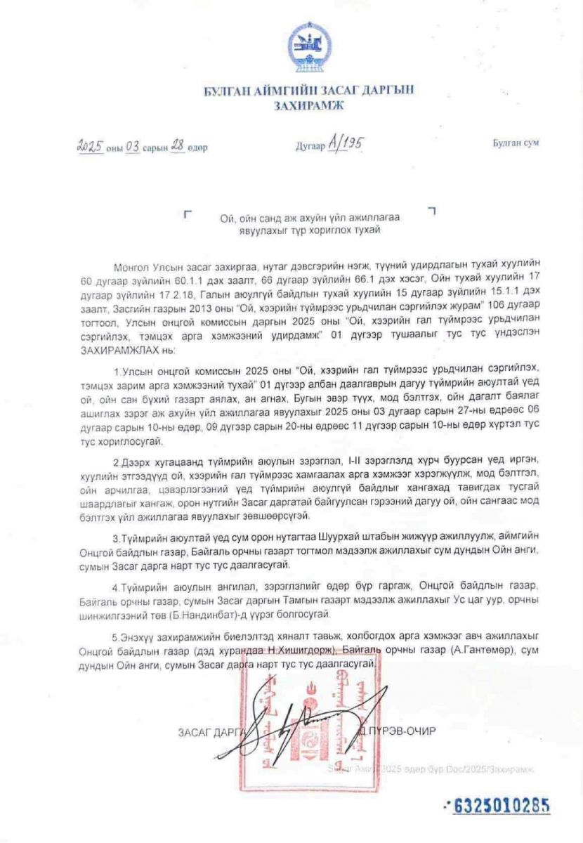 Хуурайшилтын зэрэг өндөр байгаатай холбогдуулан аймгийн Засаг даргын захирамжийн дагуу ойд аливаа үйл ажиллагаа явуулахыг хориглосон тул түлшний модны эрхийн бичиг тодорхойгүй хугацаагаар олгохгүй болохыг мэдэгдэж байна.